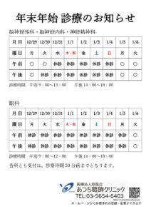 Uncategorized 年末年始診療のご案内 2025.12.03 年末年始の診療は下記の通りとなります。 ご不明の点などございましたらお電話でお問い合わせください。 年末年始診療時間のお知らせ2025.12-2026.1 Post Share 12月診療のお知らせ 前の記事